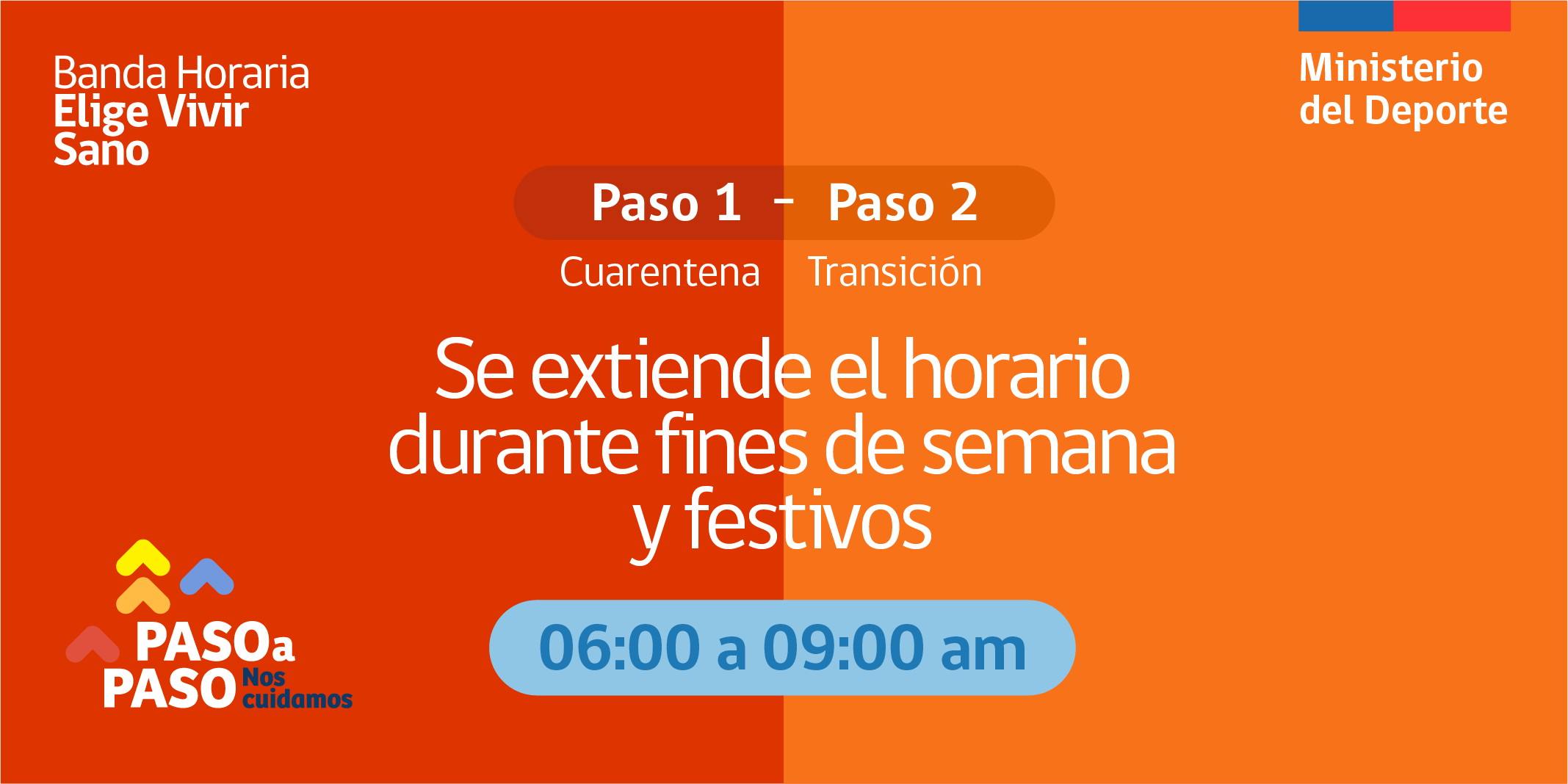 Según explicó el Seremi del Deporte Christian Yantani, la extensión horaria para los fines de semana y festivos permitirá realizar actividad física entre las 6 y las 9 de la mañana. Esta actualización, incorporada en la última versión del Instructivo de Desplazamiento, permitirá aumentar el tiempo disponible para realizar actividad física durante los fines de semana y festivos en las comunas que se encuentre en Paso 1 – Cuarentena o Paso 2 – Transición, mientras que en la fase de cuarentena de lunes a viernes se mantienen los horarios habituales de 7 a 8:30 de la mañana.