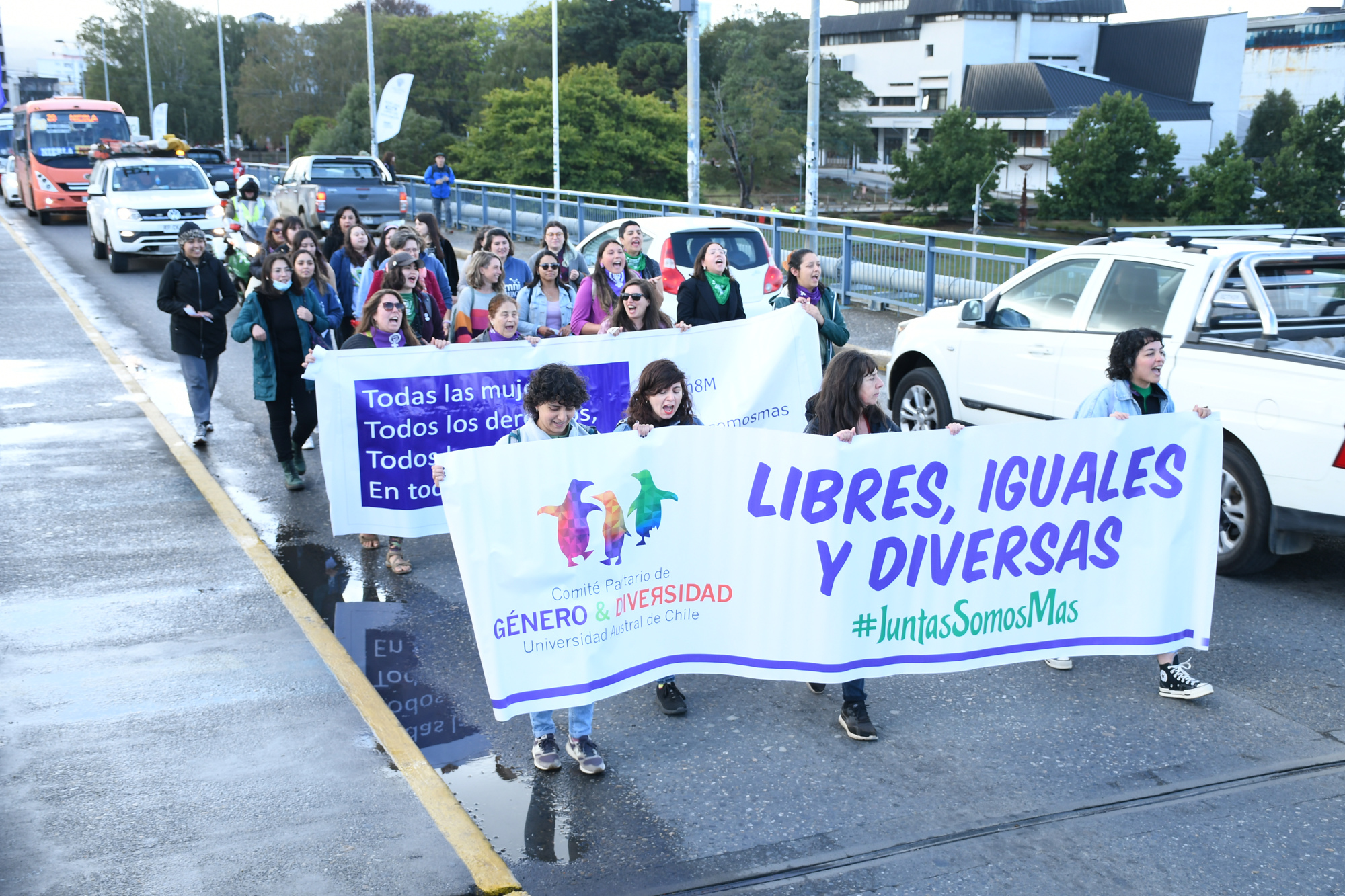 Así, en Valdivia el Comité Triestamental de Género y Diversidad de la casa de estudios convocó a las mujeres de la comunidad universitaria para marchar este viernes 8 de marzo desde el Centro de Extensión Los Canelos –ubicado en Yerbas Buenas con General Lagos– hacia el centro de la ciudad para luego dirigirse al acceso al Jardín Botánico en el Campus Isla Teja. En ese lugar se llevó a cabo un acto de cierre desde las 11.30 hrs.