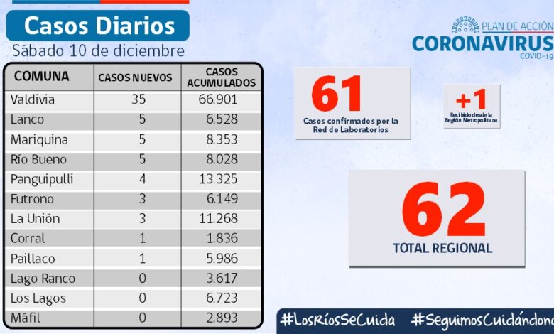 Autoridad sanitaria de los Ríos informó de 62 nuevos contagios , hay 120 contagios activos y de los 72 corresponden a Valdivia .