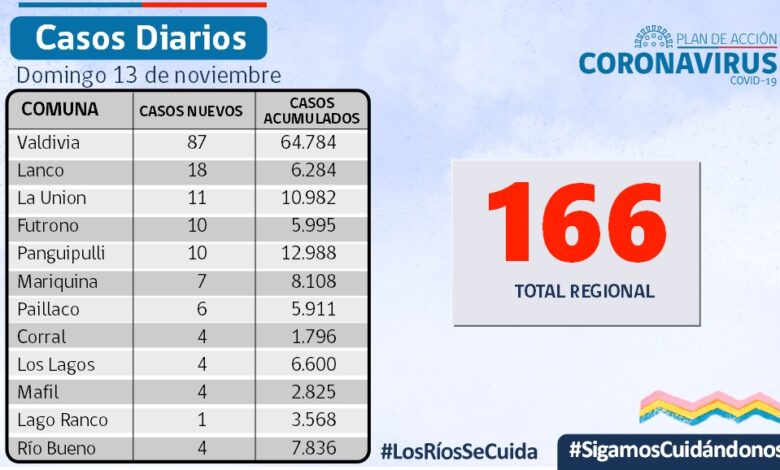 Autoridad sanitaria informó 166 nuevos contagios en los Ríos.