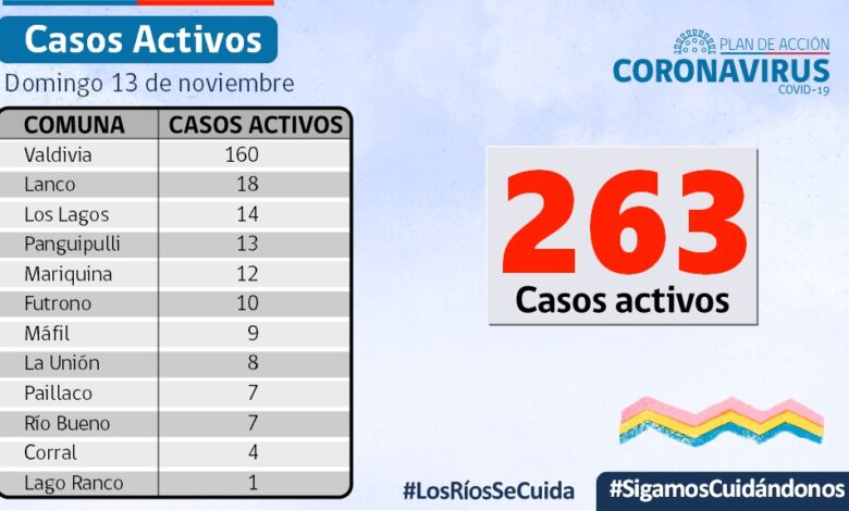 A la fecha, hay 263 casos activos, de los cuales 160 corresponden a la comuna de Valdivia y 18 a la comuna de Lanco.