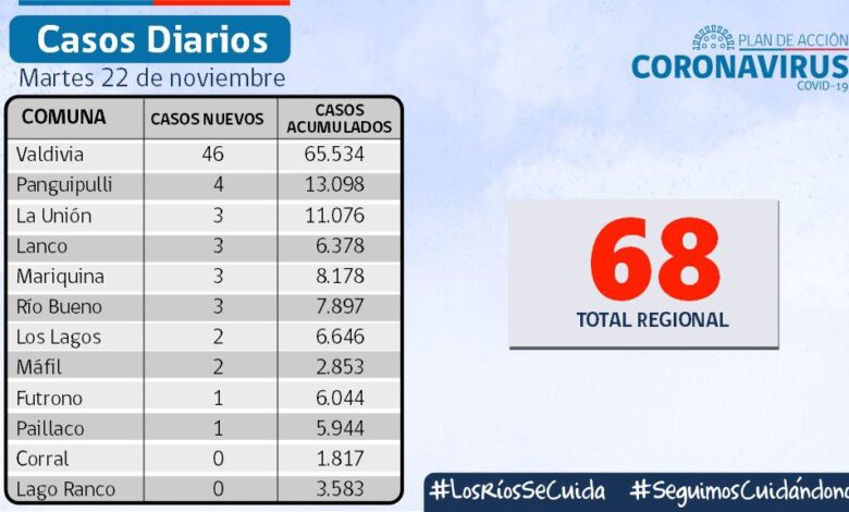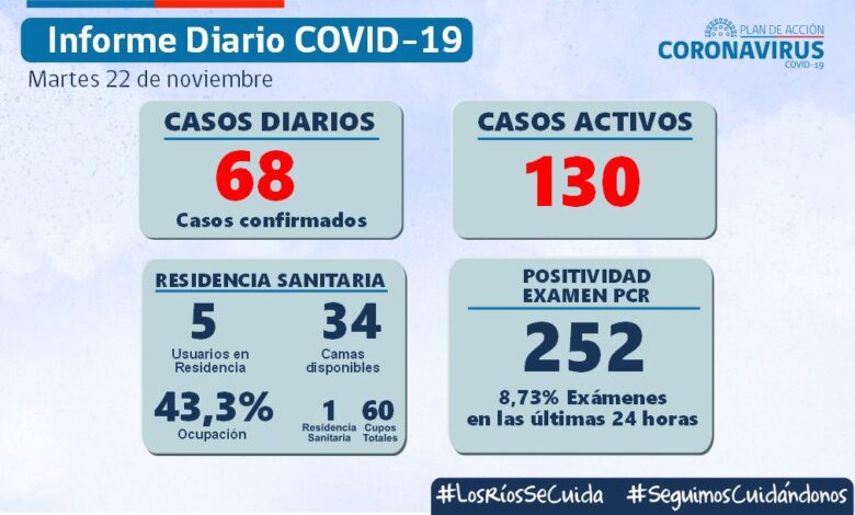 Autoridad sanitaria informó de 68 nuevos casos y 130 contagios activos a la fecha en los Ríos