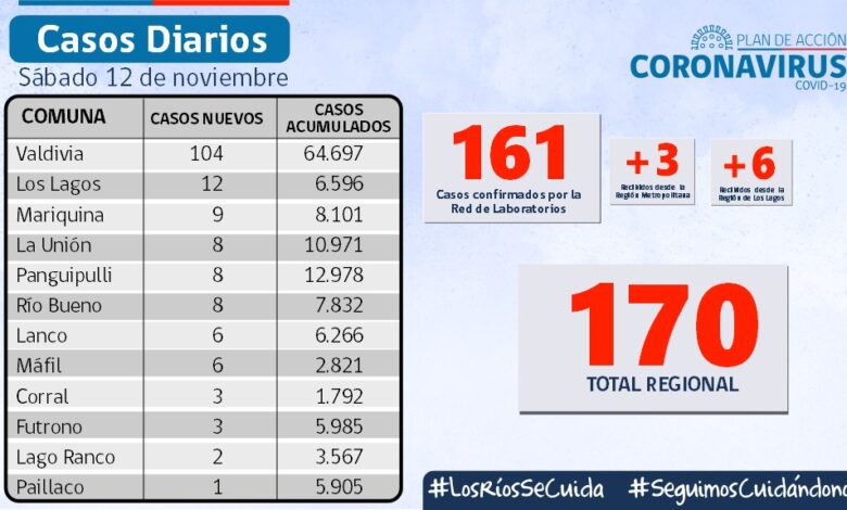Autoridad sanitaria reporta 170 nuevos casos de Covid-19 , hay 289 contagios activos en los Ríos