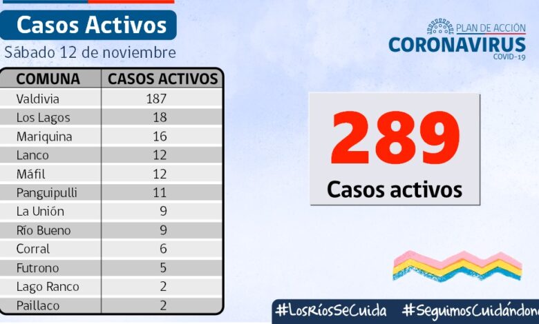 A la fecha, hay 289 casos activos, de los cuales 187 corresponden a la comuna de Valdivia y 18 a la comuna de Los Lagos.