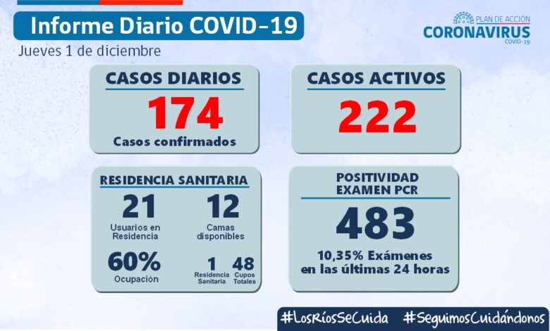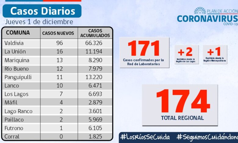 Autoridad sanitaria reportó 174 contagios nuevos, hay 1.123 personas fallecidas por causas asociadas al Covid-19, en los Ríos