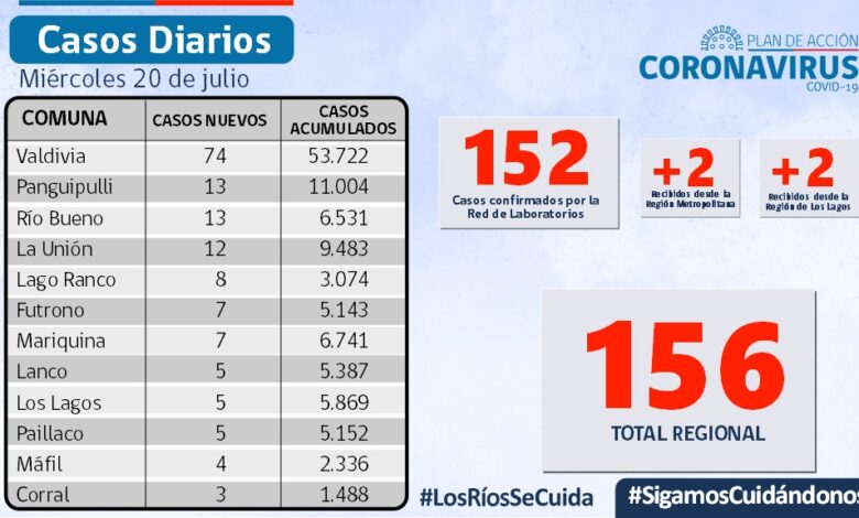 La Secretaría Regional Ministerial de Salud Los Ríos informó que 152 exámenes resultaron positivos para SARS-CoV-2. Adicionalmente, se recibieron dos casos desde la región Metropolitana y 2 casos desde la región de Los Lagos. Del total de casos, 52 se diagnosticaron mediante test PCR y 104 fueron pesquisados con test de antígeno.