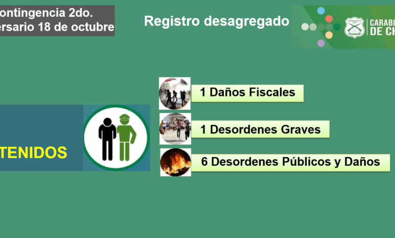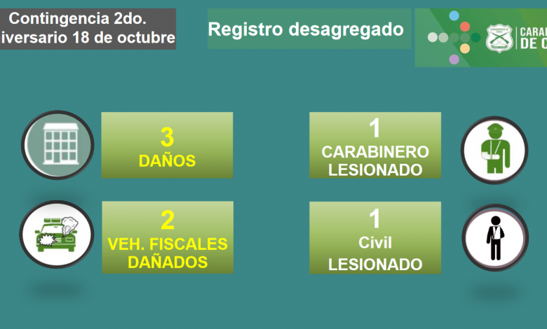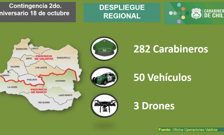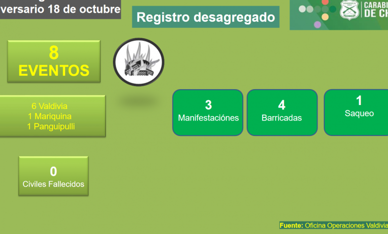 Ocho personas detenidas, un carabinero con contusiones y un civil con una pedrada en su cabeza es parte del balance entregado por la policía uniformada tras los hechos ocurridos la tarde de este lunes en la región de Los Ríos, en el marco del segundo aniversario del 18 de octubre.
