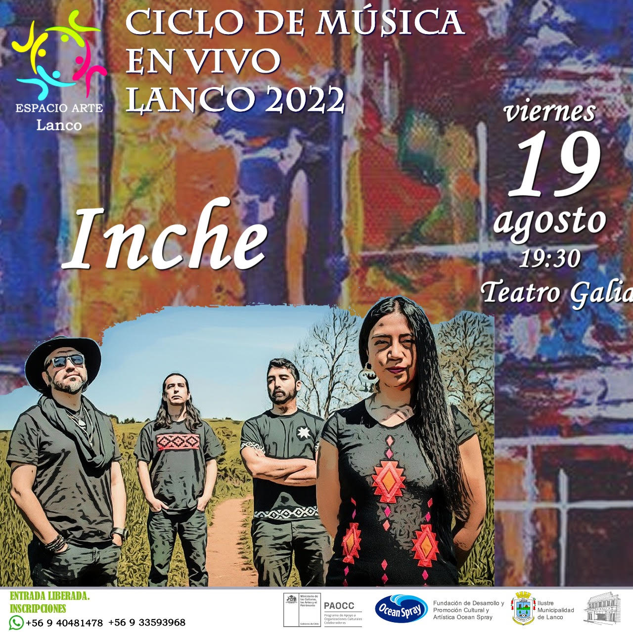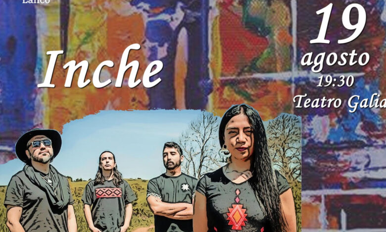 INCHE (palabra del mapudungün que significa YO SOY) @inche_musica, banda de la ciudad de Temuco que inicia el trabajo musical en marzo del año 2018 con el objetivo de promover la cultura mapuche por medio del liderazgo femenino, fusionando los sonidos mapuches con el rock y rescatando en las letras aspectos de la cosmovisión, rol de la mujer mapuche y la memoria histórica y que está compuesta por Paola Linconao Caniulaf (voz, guitarra electroacústica e instrumentos mapuches), Nicolás Molina Rojas (bajo eléctrico y coros), Patricio Chico Alarcón (guitarra eléctrica y coros) y Javier Huiliñir Curío (batería), realizará un concierto gratuito el próximo viernes 19 de agosto a las 19:30hrs en el Teatro Galia de la comuna de Lanco, ubicado en Calle Arturo Prat N° 139.