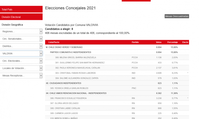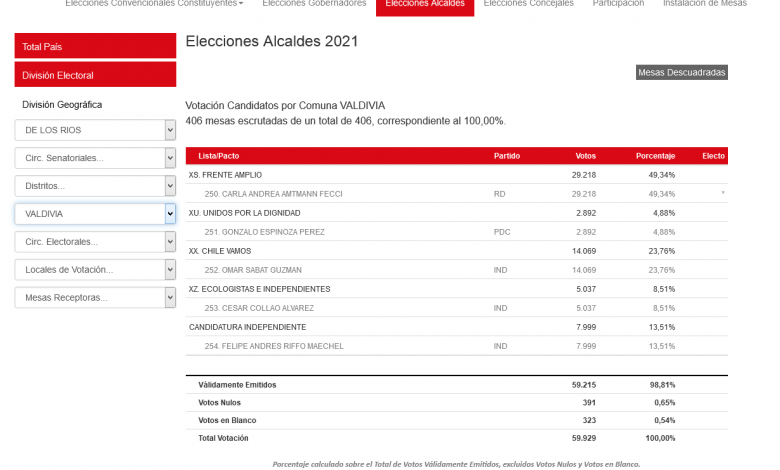 Boletin Servel de Comuna de Valdivia 406 mesas escrutadas de un total 406, correspondientes al 100.00% Electa en Valdivia Carla Antmann como nueva Alcalde de la capital de los Rios.