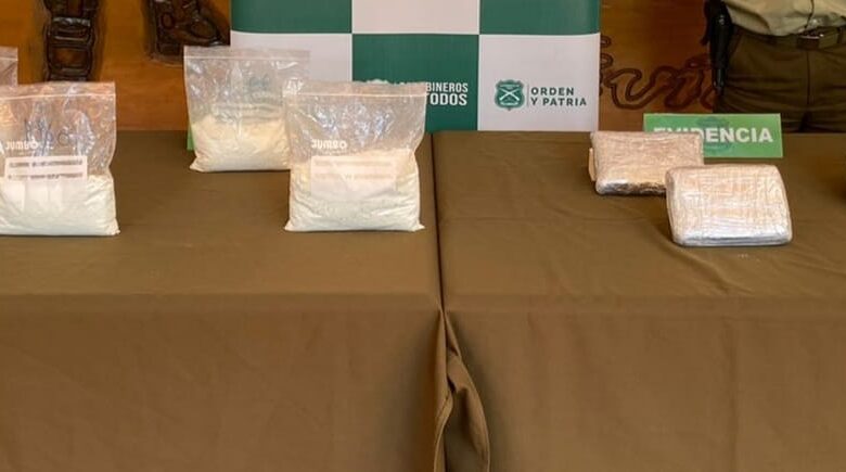 Carabineros del OS7 Valdivia decomisó 11 kilos 685 gramos de cocaína y pasta base. La primera sustancia fue encontrada en equipaje de pasajero que viaja en bus por Ruta 5 Sur y la segunda, en vehículo robado, cuyo conductor huyó en Pobl Valparaíso de Valdivia.