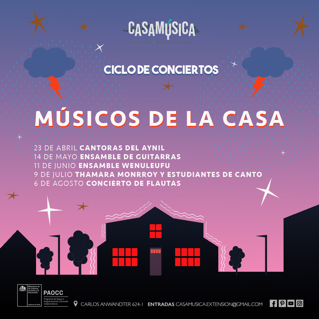 Los seis conciertos son totalmente gratuitos y se llevarán a cabo en un formato íntimo en el barrio tradicional Carlos Anwandter 624, para registrarse solo debes enviar un correo a: casamusica.extension@gmail.com o por la aplicación de Whatsapp +56 9 41269459.