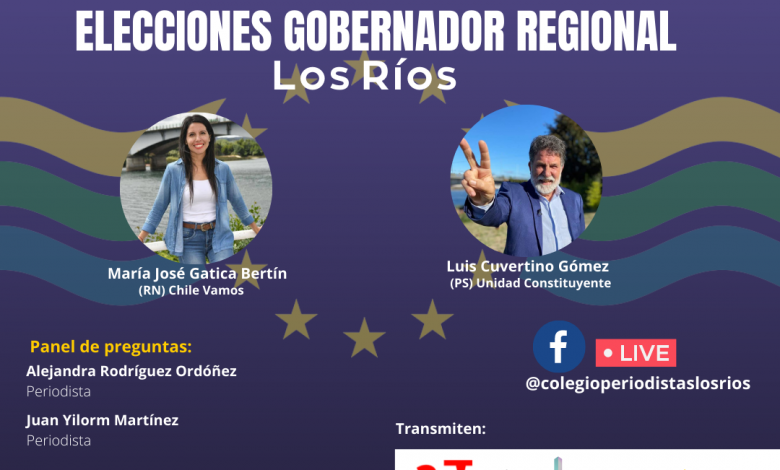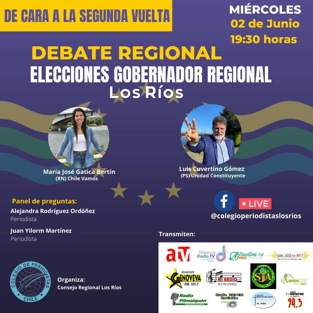 El miércoles 02 de junio, a las 19:30 horas se llevará a cabo un debate regional donde participarán las dos candidaturas a gobernador regional por Los Ríos de cara a la segunda vuelta. La actividad, organizada por el Consejo Regional del Colegio de Periodistas, tiene por objetivo generar un espacio de información para que la comunidad conozca las propuestas de María José Gatica (RN) y Luis Cuvertino (PS) y así ejercer un voto informado, el próximo 13 de junio. El debate será transmitido por Facebook Live desde www.facebook.com/colegioperiodistaslosrios como también en trece medios de comunicación de la región, en su mayoría radios comunales.