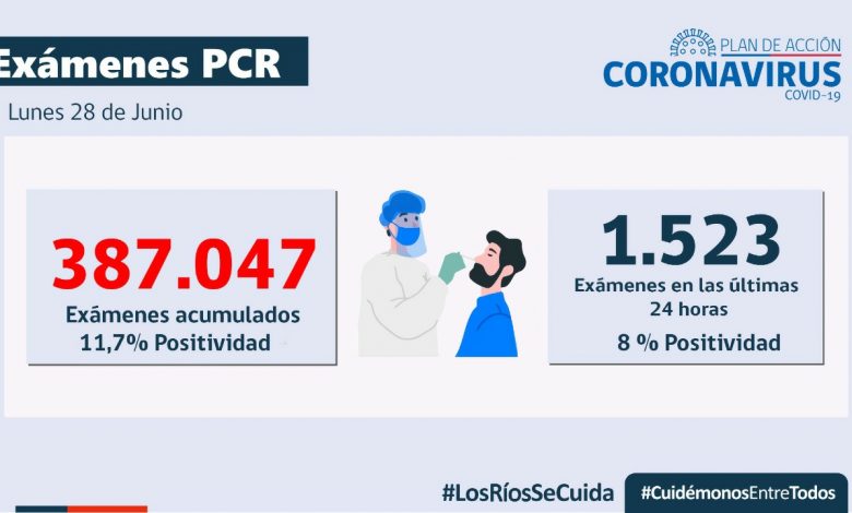 La Red de Laboratorios de Los Ríos procesó en las últimas 24 horas, 1.523 muestras, arrojando un índice diario de positividad de 8 %. La cantidad total de exámenes PCR realizados en la región asciende a 387.047 con una positividad acumulada de 11,7%.