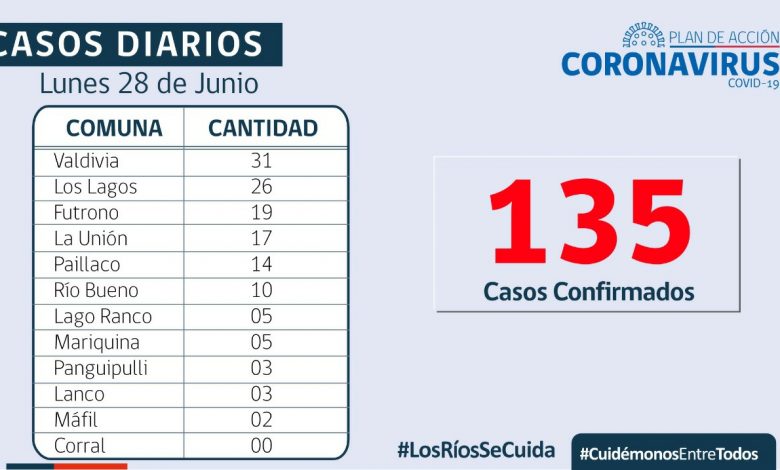 De los 135 casos confirmados por residencia en Los Ríos, 113 corresponden a casos secundarios, 15 aún están sin trazabilidad y 7 se encuentran en investigación. En tanto, a la fecha, la región presenta 45.263 casos acumulados, de los cuales 1.089 corresponden a casos activos, 43.669 a personas recuperadas y 505 a fallecidos.