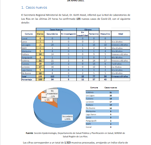 La Secretaría Regional Ministerial de Salud notificó 135 exámenes positivos para SARS-CoV-2 recibidos desde la Red de Laboratorios de Los Ríos.
