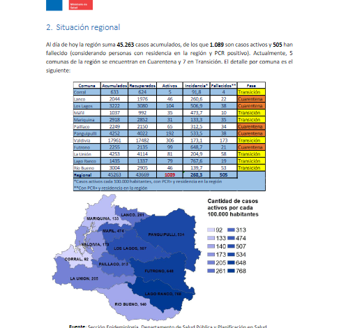 El día de hoy, la autoridad sanitaria lamenta informar el fallecimiento de diez personas. Se trata de dos hombres de 64 y 74 años de la comuna de Futrono, una mujer de 73 años de la comuna de Lago Ranco, un hombre de 74 años de Los Lagos; una mujer de 86 años y un hombre de 68 años, ambos de la comuna de Paillaco. Además de un hombre de 88 años de la comuna de Panguipulli; un hombre de 70 años de Río Bueno y dos hombres de 61 y 64 años de Valdivia.