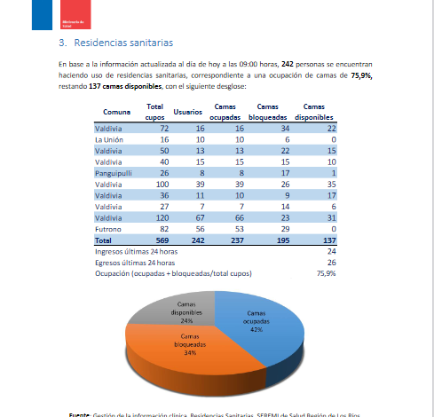 Respecto a las Residencias Sanitarias, a la fecha, 242 personas están haciendo uso de estos espacios de aislamiento, lo que representa un porcentaje de 75,9 % de camas ocupadas. Al día de hoy, quedan 137 camas disponibles en estos espacios de aislamiento.