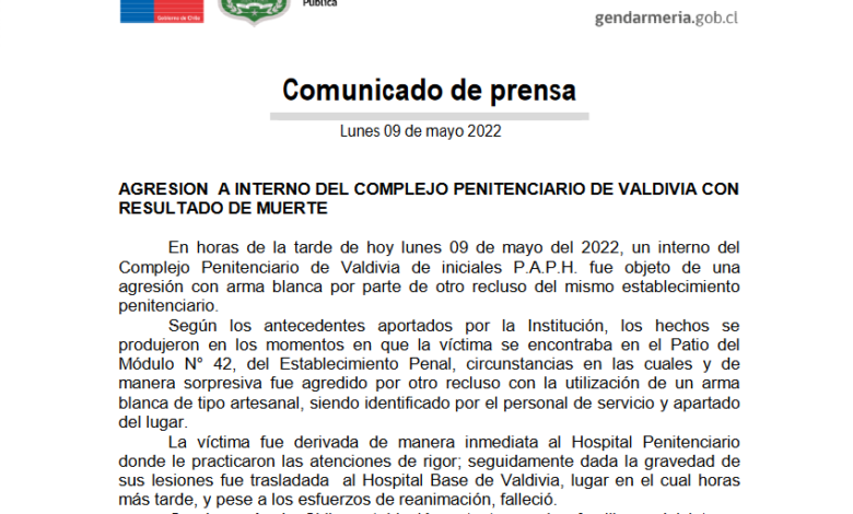 COMUNICADO GENDARMERIA : AGRESION A INTERNO DEL COMPLEJO PENITENCIARIO DE VALDIVIA CON RESULTADO DE MUERTE