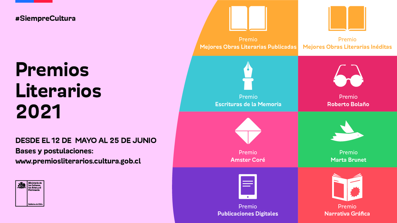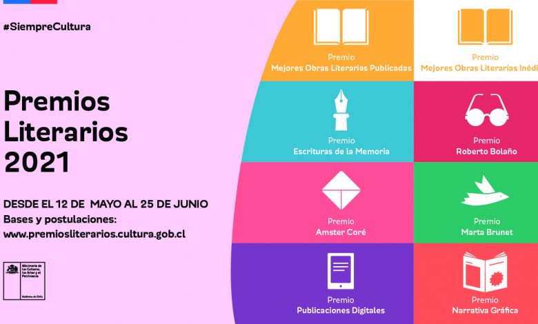El Consejo Nacional del Libro y la Lectura anunció la apertura de la convocatoria 2021 de los Premios Literarios, reconocimientos que reúnen siete galardones que a su vez tienen distintas categorías y géneros: Mejores Obras Literarias, Escrituras de la Memoria, Roberto Bolaño a la creación literaria joven, Marta Brunet a la literatura infantil y juvenil, Amster-Coré al diseño editorial y la ilustración, Narrativa Gráfica y Publicaciones Digitales.