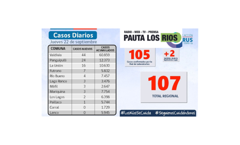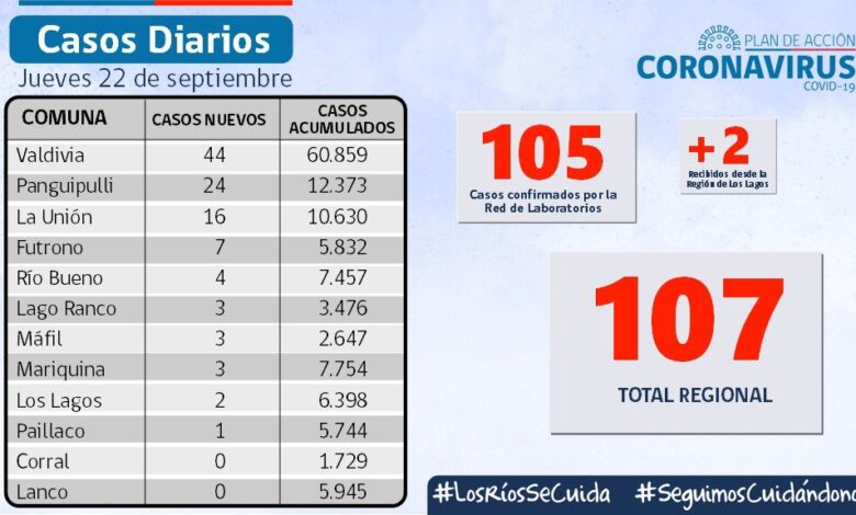 La Secretaría Regional Ministerial de Salud Los Ríos informó que 105 exámenes resultaron positivos para SARS-CoV-2. Adicionalmente, se reciben 2 casos desde la región de Los Lagos, por lo que hoy, se informan 107 nuevos casos a Covid-19. De dicho total, 30 se diagnosticaron mediante test PCR y 77 fueron pesquisados con test de antígeno.