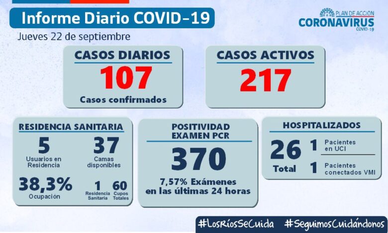 Con 217 casos activos y 107 contagios nuevos en la jornada de hoy, jueves en los Ríos