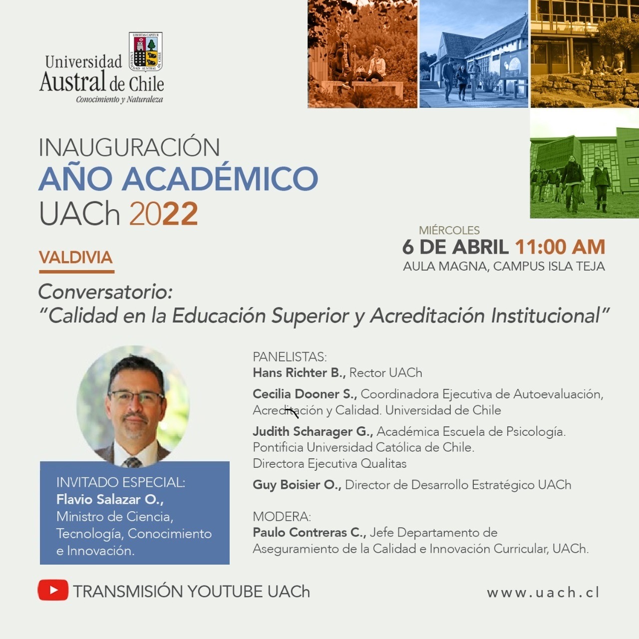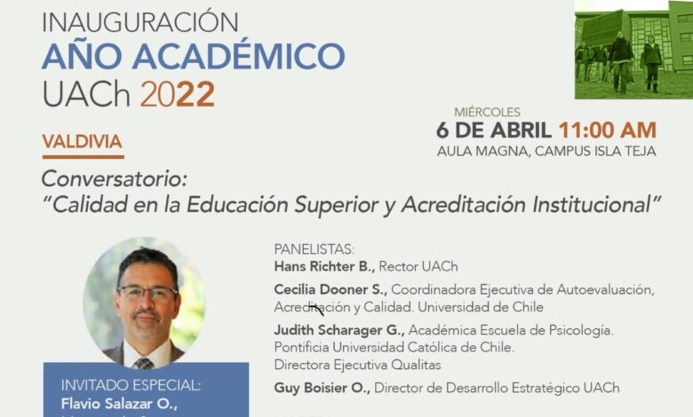 Junto al Rector Richter, en el conversatorio participarán el Dr. Guy Boisier, Director de Desarrollo Estratégico de la UACh, Cecilia Dooner, coordinadora ejecutiva de Autoevaluación, Acreditación y Calidad de la U. de Chile, y Judith Scharager, académica de la Escuela de Psicología de la Pontificia U. Católica de Chile y directora ejecutiva de Qualitas.