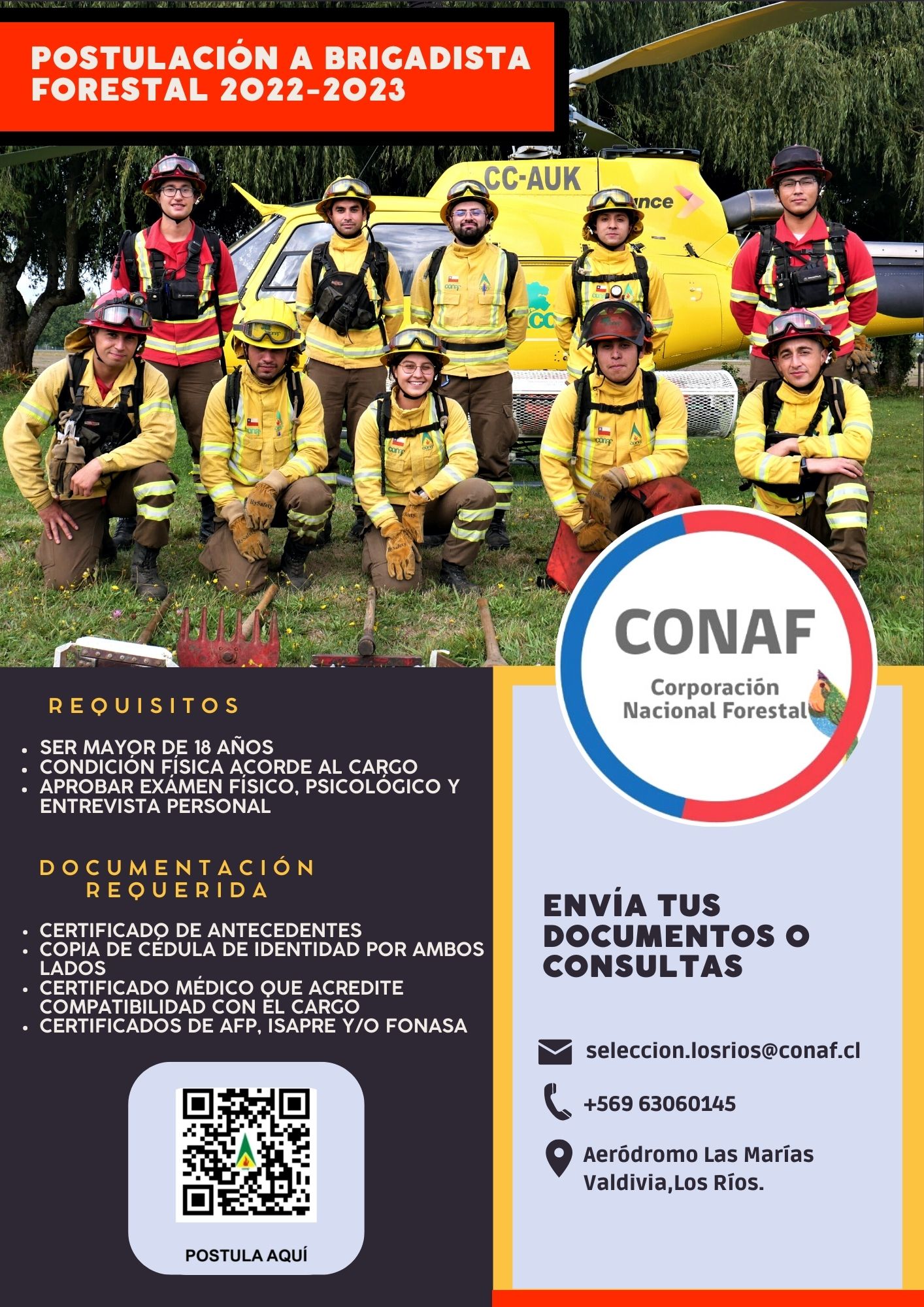 Para ser brigadista forestal de CONAF debes ser mayor de 18 años, con una condición física acorde al cargo, aprobar examen físico y psicológico. Además de ello certificado de antecedentes, y certificado médico que acredite compatibilidad con el cargo. Para mayor información puedes enviar tus consultas al correo indicado más arriba de la nota o bien llamar al número +569 63060145.