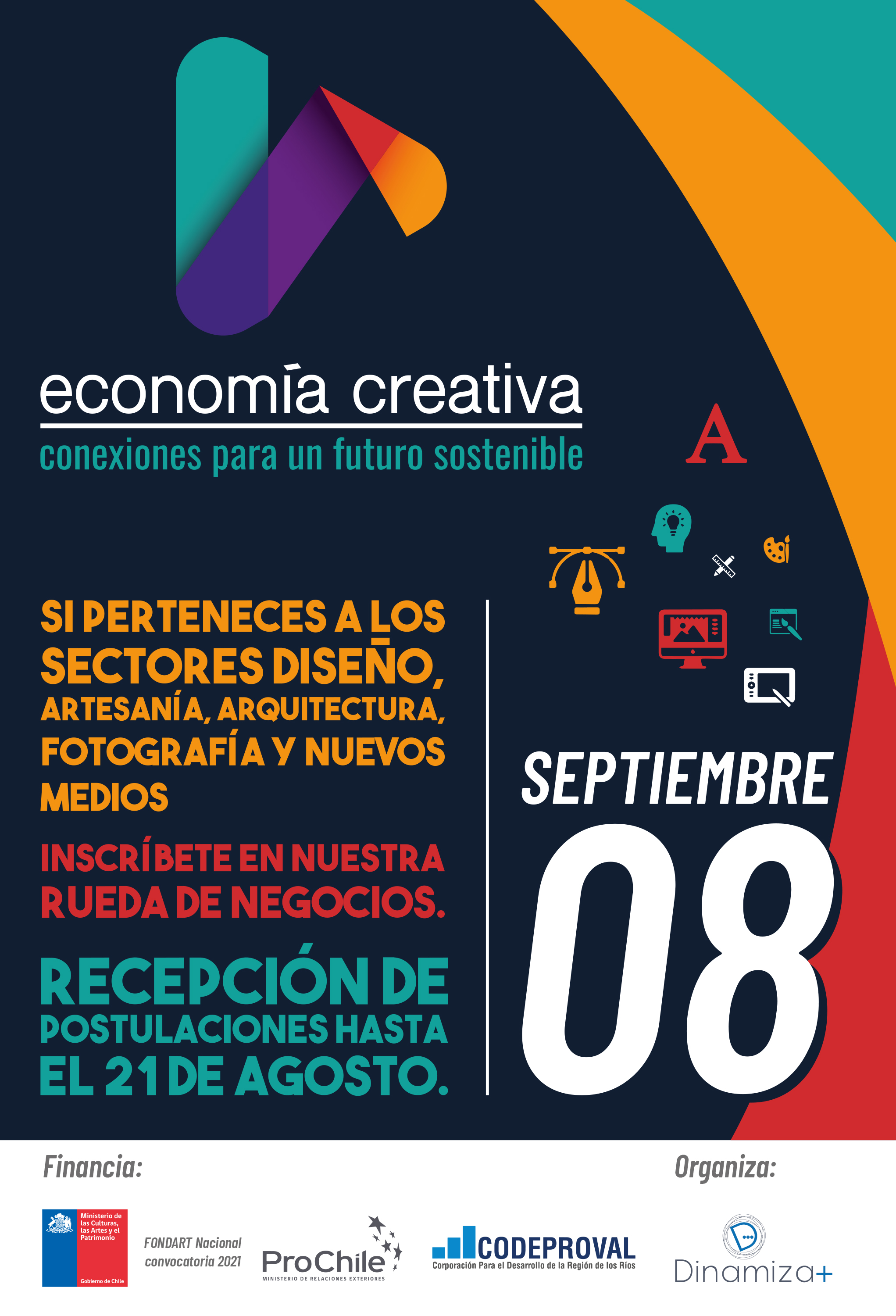 Fortalecer las redes de contacto y abrir oportunidades para la concreción de nuevos negocios para el sector creativo, es una de las principales motivaciones de “Economía Creativa, conexiones para un futuro sostenible”, proyecto financiado por el Fondart Nacional 2021 del Ministerio de las Culturas, las Artes y el Patrimonio, apoyado por Codeproval y Prochile Los Ríos e impulsado por Dinamiza+ consultora de la región de Los Ríos enfocada en temas de innovación, fomento del entorno empresarial y desarrollo económico sostenible con enfoque territorial desde una mirada global.