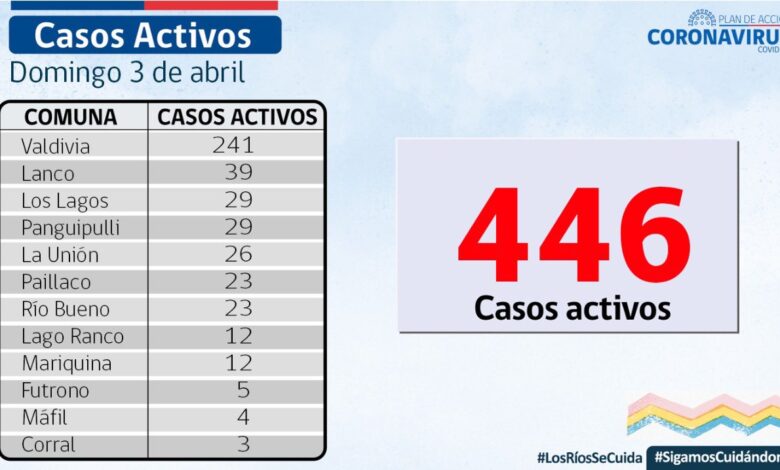 A la fecha, hay 446 casos activos, de los cuales 241 corresponden a la comuna de Valdivia y 39 a la comuna de Lanco.