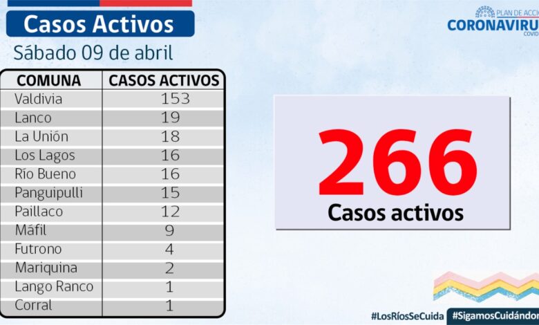 A la fecha, hay 266 casos activos, de los cuales 153 corresponden a la comuna de Valdivia y 19 a la comuna de Lanco.