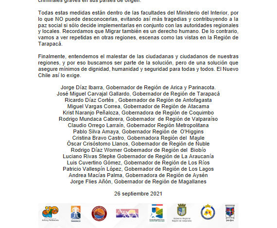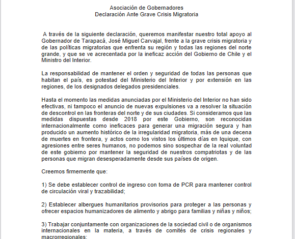A través de la siguiente declaración, queremos manifestar nuestro total apoyo al Gobernador de Tarapacá, José Miguel Carvajal, frente a la grave crisis migratoria y de las políticas migratorias que enfrenta su región y todas las regiones del norte grande, y que se ve acrecentada por la ineficaz acción del Gobierno de Chile y el Ministro del Interior.