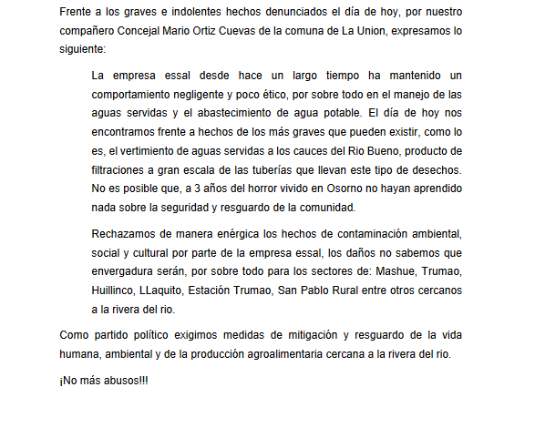 Declaración pública ante la gravedad de la suspensión del suministro de agua potable en la comuna de la Unión
