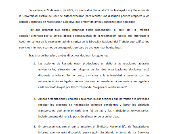 Declaración pública conjunta de los sindicatos Nacional N°1 de Trabajadores y Docentes de la Universidad Austral de Chile