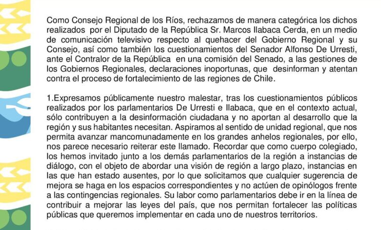 Como Consejo Regional de los Ríos, rechazamos de manera categórica los dichos realizados por el Diputado de la República Sr. Marcos Ilabaca Cerda, en un medio de comunicación televisivo respecto al quehacer del Gobierno Regional y su Consejo, así como también los cuestionamientos del Senador Alfonso De Urresti, ante el Contralor de la República en una comisión del Senado, a las gestiones de los Gobiernos Regionales, declaraciones inoportunas, que desinforman y atentan contra el proceso de fortalecimiento de las regiones de Chile.