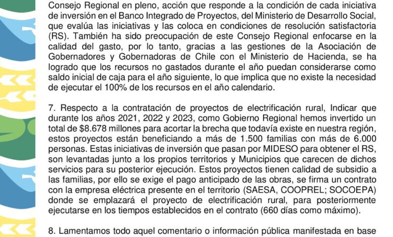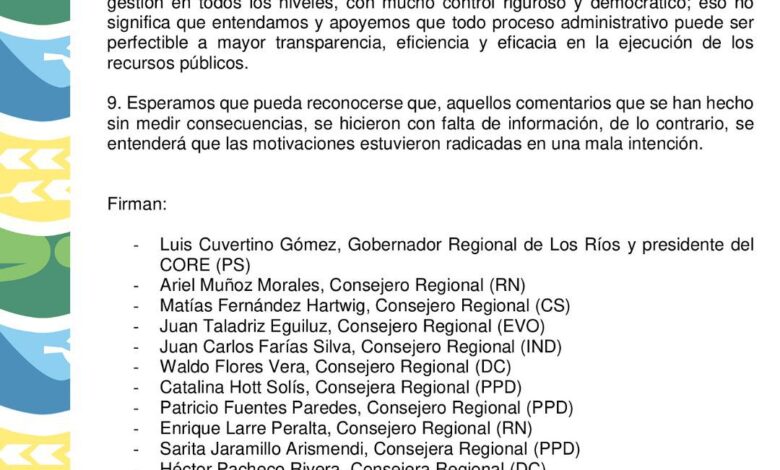 - Lamentamos todo aquel comentario o información pública manifestada en base a mentiras, medias verdades o desinformación, por parte de los parlamentarios mencionados, especialmente al Diputado Ilabaca, ya que dañan profundamente el proceso de descentralización que tanto nos ha costado instalar en el país. Están dañando también la propia legitimidad del quehacer del Gobierno Regional y su Consejo Regional de Los Ríos, lo que nos lleva a un punto de cuestionamiento público abusivo. Creemos importante mencionar que tenemos una situación administrativa no cuestionada, correcta, hasta ahora intachable y un ejercicio de gestión en todos los niveles, con mucho control riguroso y democrático; eso no significa que entendamos y apoyemos que todo proceso administrativo puede ser perfectible a mayor transparencia, eficiencia y eficacia en la ejecución de los recursos públicos.