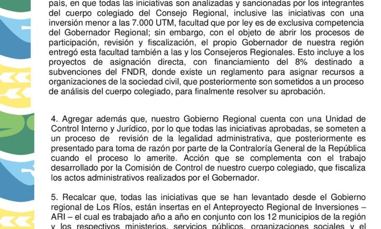 - En relación a la discrecionalidad y descontrol que se acusa para los procesos de asignación de financiamiento en nuestro Gobierno Regional, queremos nuevamente recordar que el Gobierno Regional de Los Ríos es posible que sea el único en el país, en que todas las iniciativas son analizadas y sancionadas por los integrantes del cuerpo colegiado del Consejo Regional, inclusive las iniciativas con una inversión menor a las 7.000 UTM, facultad que por ley es de exclusiva competencia del Gobernador Regional; sin embargo, con el objeto de abrir los procesos de participación, revisión y fiscalización, el propio Gobernador de nuestra región entregó esta facultad también a las y los Consejeros Regionales. Esto incluye a los proyectos de asignación directa, con financiamiento del 8% destinado a subvenciones del FNDR, donde existe un reglamento para asignar recursos a organizaciones de la sociedad civil, que posteriormente son sometidos a un proceso de análisis del cuerpo colegiado, para finalmente resolver su aprobación.