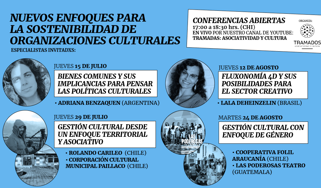 Es en este marco, que la Asociación Cultural Tramados, dedicada a mejorar las condiciones en que los y las trabajadoras de esta área desarrollan su labor; invita al ciclo “Nuevos enfoques para la sostenibilidad de organizaciones culturales” un curso formativo que presentará cuatro Clases magistrales abiertas a todo público con especialistas de Latinoamérica y que, además, culminará con una publicación como insumo permanente, en torno a las principales materias del encuentro.