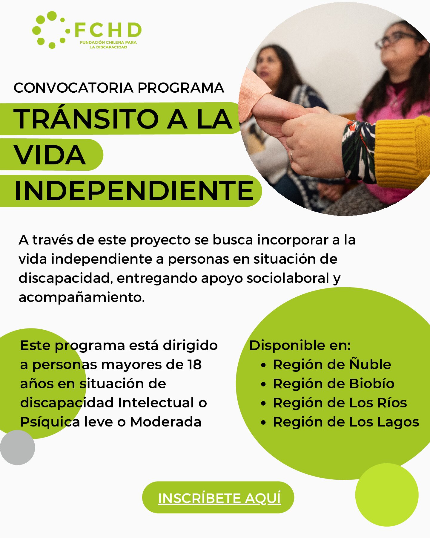 Breve descripción del programa: Este programa tiene por objetivo “Propiciar el Tránsito a la Vida Independiente mediante la inclusión sociolaboral, de personas en situación de discapacidad de causa psíquica o intelectual, (leve y/o moderada) en la Región de los Ríos a través de la capacitación, colocación y acompañamiento a un puesto de trabajo”. El cual posee una duración de 24 meses. Se realizará en modalidad online y es totalmente GRATUITO.