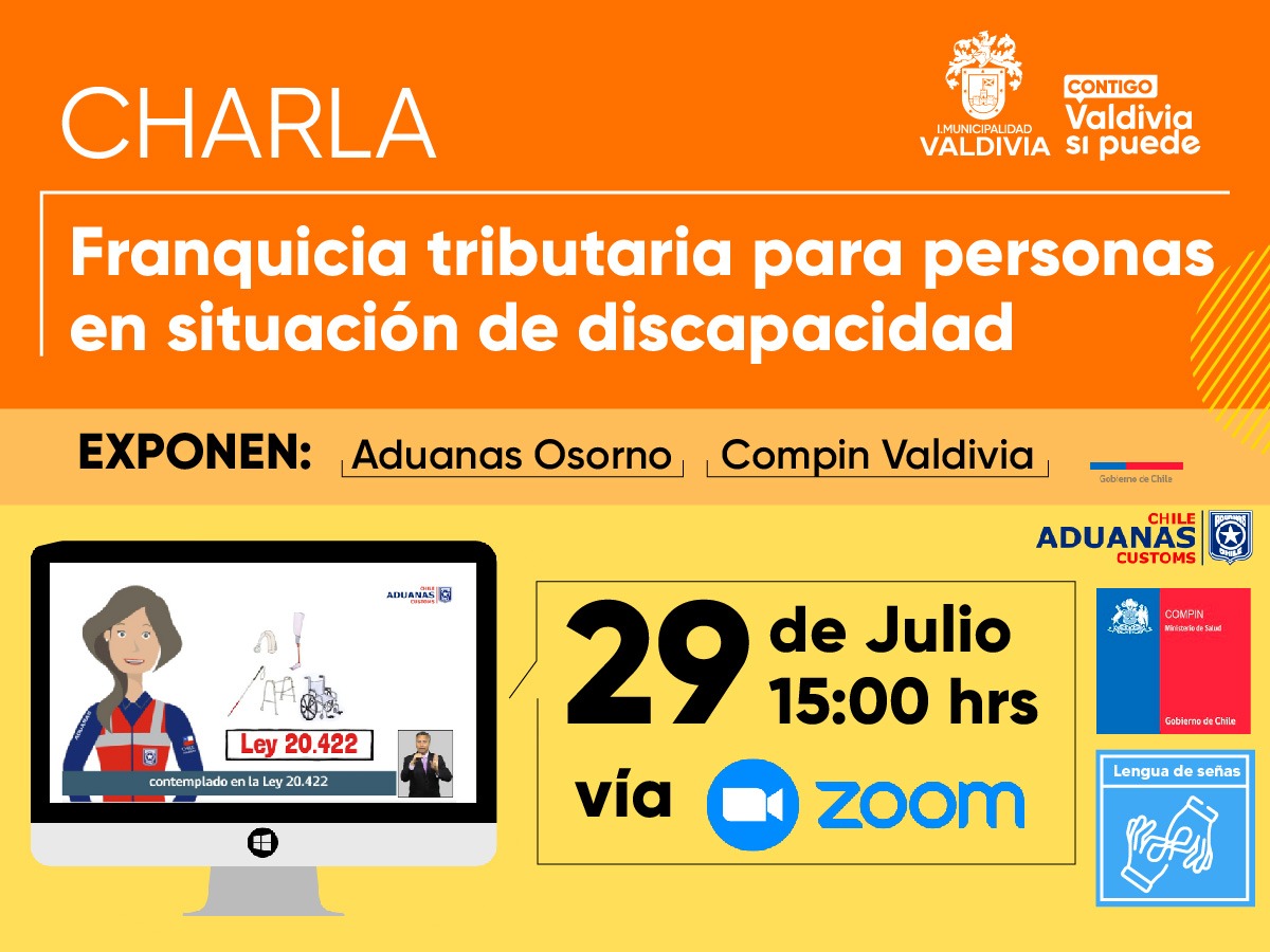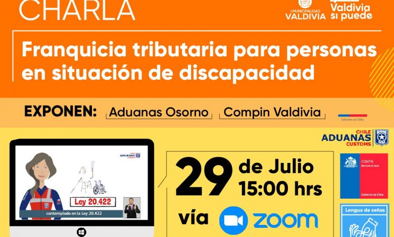 Con el objetivo de orientar a las personas en situación de discapacidad y a sus cuidadores/as, o representantes legales, sobre el uso y operación del beneficio de la Franquicia Tributaria de aduanas para la compra e importación de vehículos y ayudas técnicas en el extranjero, incorporando la operación de este desde la Comisión de Medicina Preventiva e Invalidez (COMPIN) y Aduanas Osorno, es que la Municipalidad de Valdivia ha organizado una charla informativa para el próximo jueves 29 de julio a partir de las 15:00 horas.