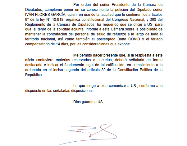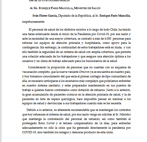 El diputado por la región de Los Ríos y senador electo, Iván Flores García, insistió mediante oficio al Ministro de Salud, Enrique Paris, extender los contratos a honorarios de los funcionarios de salud que han sido incorporados como refuerzo durante la pandemia, ya que a juicio del parlamentario “es importante y necesario seguir contando con su compromiso y atención frente a una pandemia que aún no finaliza ni está controlada”.