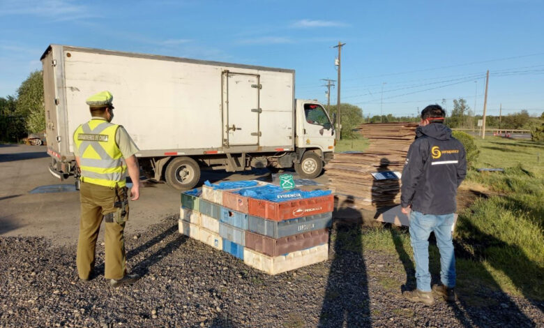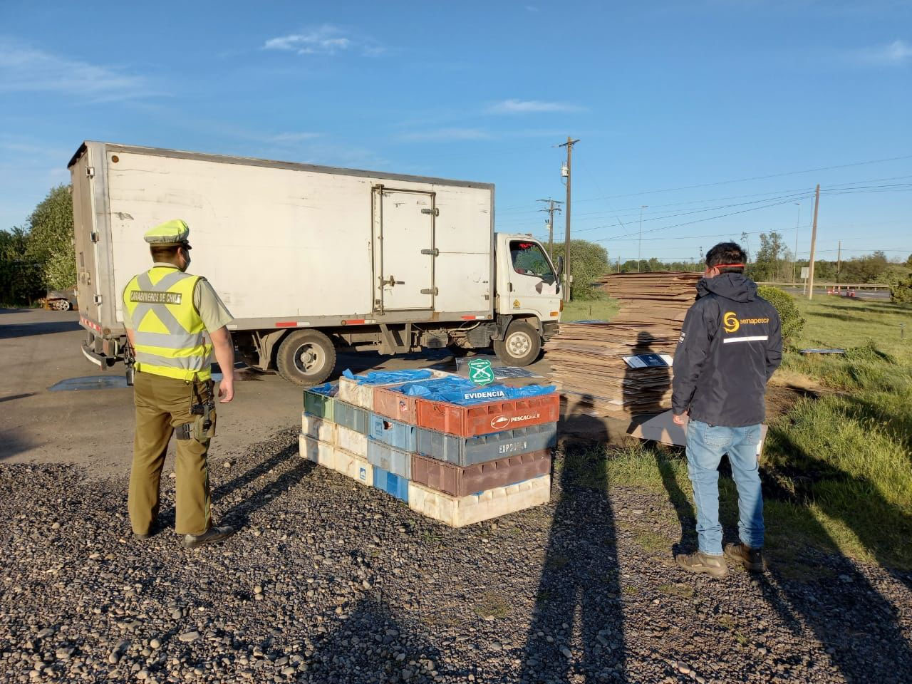 Durante el fin de semana en un control carretero en la ruta 5 a la altura de La Unión, funcionarios del Servicio Nacional de Pesca y Acuicultura (Sernapesca) Los Ríos junto a personal de Carabineros de la Tenencia Carretera de Valdivia, fiscalizaron un camión 3/4 que transportaba 1.985 kilos de recursos del mar, de los cuales sólo 1.200 contaban con la documentación para acreditar su origen legal.