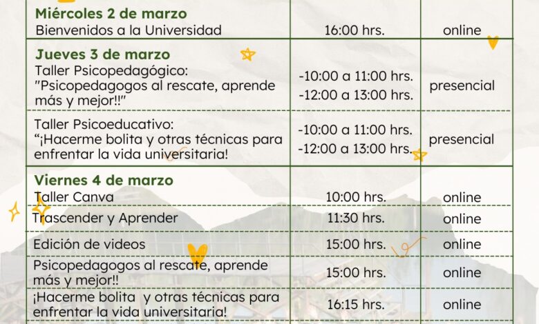 Para este año, la primera actividad planificada se titula “Bienvenidos a la Universidad”, correspondiente a la bienvenida oficial que se llevará a cabo el 2 de marzo de manera online para aquellos estudiantes matriculados en la Sede Valdivia. Posteriormente, las actividades lúdicas y talleres de inducción se realizarán el jueves 3 de marzo en modalidad presencial, si la situación sanitaria lo permite y el 4 de marzo en modalidad virtual. Finalmente, para el 11 de marzo, se efectuará la bienvenida presencial denominada «Sin PACE no hay movilidad».