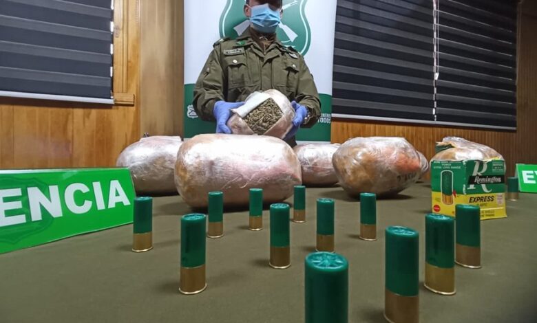 El decomiso de 8 kilos 118 gramos de marihuana elaborada y 24 cartuchos de escopeta, dejó como resultado el registro de una maleta