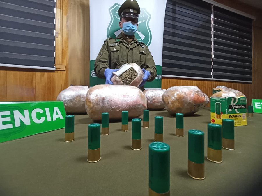 El decomiso de 8 kilos 118 gramos de marihuana elaborada y 24 cartuchos de escopeta, dejó como resultado el registro de una maleta no reclamada en el Terminal de Buses de #Valdivia. Carabineros del OS7 y los canes detectores Gema y Fender realizaron el hallazgo.