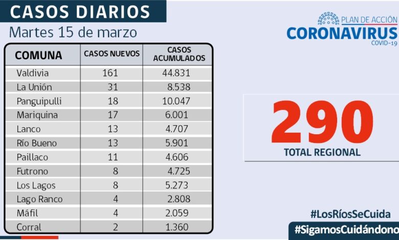 De los 290 nuevos contagios, 151 corresponden a personas de sexo femenino y 139 personas de sexo masculino, con un rango etario entre 9 meses y 89 años. A la fecha, la región presenta 100.856 casos acumulados, de los cuales 1.801 corresponden a casos activos, 98.183 a personas recuperadas y 872 a fallecidos.