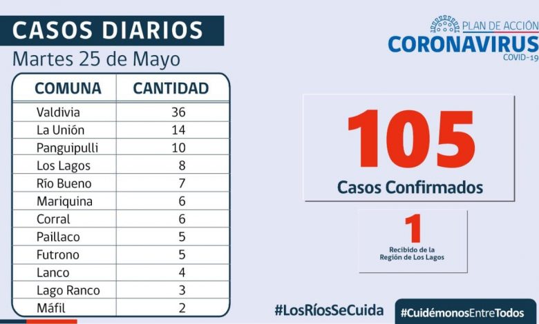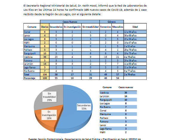 La Secretaría Regional Ministerial de Salud notificó 105 exámenes positivos para SARS-CoV-2 recibidos desde la Red de Laboratorios de Los Ríos, adicionalmente se recibió desde la región de Los Lagos un nuevo caso confirmado correspondiente a una persona residente en nuestra región. Es así, que hoy, Los Ríos suma 106 nuevos casos de Covid-19.