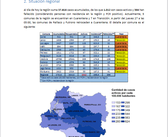 De los 106 casos confirmados por residencia en Los Ríos, 51 corresponden a casos secundarios, 31 aún están sin trazabilidad y 17 se encuentran en investigación. En tanto, a la fecha, la región presenta 37.816 casos acumulados, de los cuales 1.012 corresponden a casos activos, 36.410 a personas recuperadas y 394 a fallecidos.