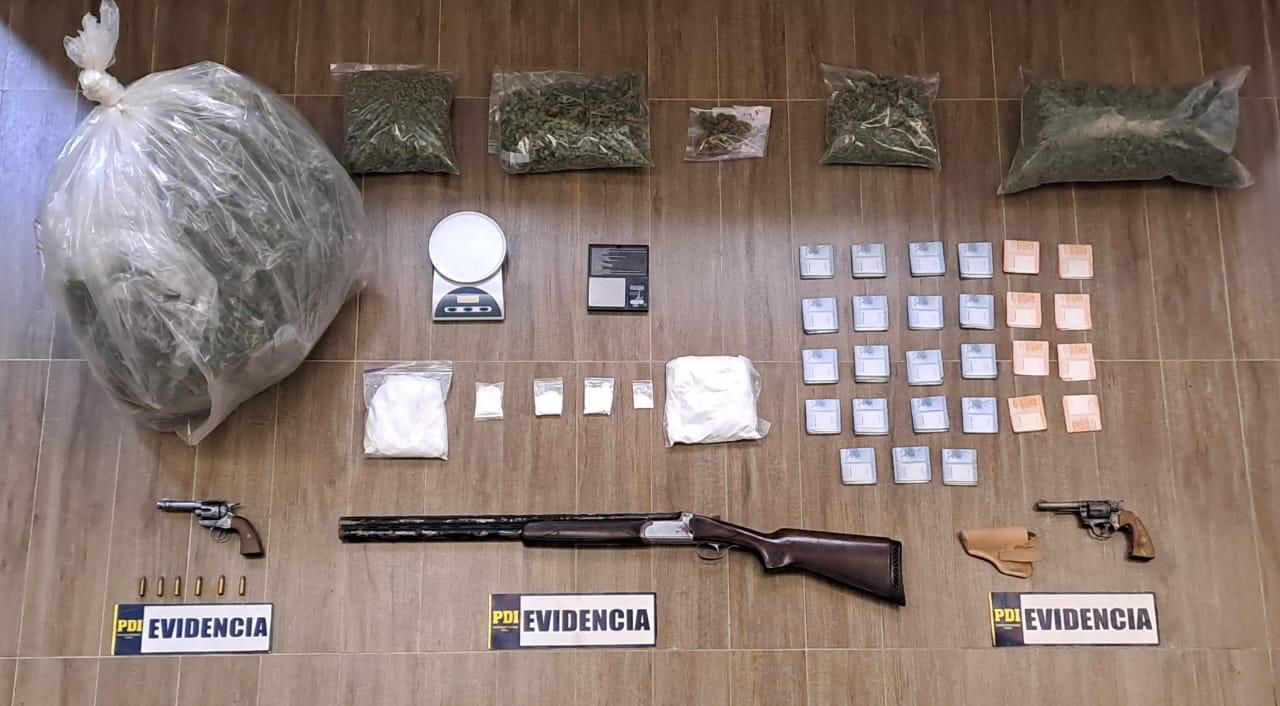 Respecto a lo incautado, se trata de alrededor de 6 kilos de drogas entre cannabis sativa, clorhidrato de cocaína, 5 plantas de cannabis, además de alrededor de un kilo de cafeína pura, presumiblemente para el abultamiento de la droga. Junto con ello, se incautaron 1 escopeta, 2 revolver, municiones y 3 millones 451 mil pesos en dinero efectivo, además de elementos de interés criminalístico.