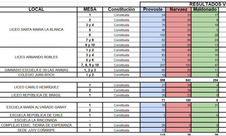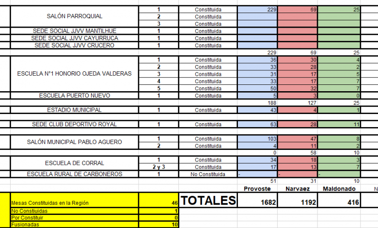 En Los Ríos, Provoste 1.682 votos, Narváez 1.192 y Maldonado 416 votos.