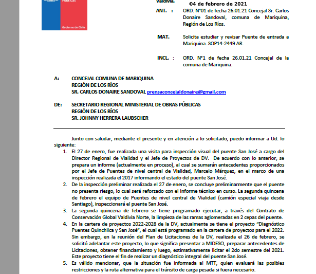 El Concejal por Mariquina Carlos Donaire se manifestó bastante preocupado por la actual situación que vive el puente principal de acceso a la comuna de Mariquina y que data del año 1929 , motivo por el cual oficio al Mop Regional el día 26 de Enero de 2021 en la cual solicita a este organismo estudiar y revisar el puente de entrada a esa comuna y que tal como mostrara en una grabación de  Andrés Roa se observa un deterioro evidente en sus cepas, el oficio de la autoridad de Mariquina esta dirigido fundamentalmente al Seremi de Obras Publicas de la Region Jonny Herrera para que de respuestas a la ciudadanía en esta delicada materia de interés publico indico Donaire . En tanto desde el Mop vía oficio le comunicaron a Carlos Donaire que »     El 27 de enero, fue realizada una visita para inspección visual del puente San José a cargo del Director Regional de Vialidad y el Jefe de Proyectos de DV. De acuerdo con lo anterior, se prepara un informe (actualmente en proceso), al cual se sumarán antecedentes proporcionados por el Jefe de Puentes de nivel central de Vialidad, Marcelo Márquez, en el marco de una inspección realizada el 2017 informando el estado del puente San José. 2.-De la inspección preliminar realizada el 27 de enero, se concluye preliminarmente que el puente no presenta riesgo, lo cual será reforzado con el informe técnico en curso. La segunda quincena de febrero el equipo de Puentes de nivel central de Vialidad (camión especial viaja desde Santiago), inspeccionará el puente San José.3.-La segunda quincena de febrero se tiene programado ejecutar, a través del Contrato de Conservación Global Valdivia Norte, la limpieza de las ramas aglomeradas en 2 cepas del puente, en este punto se pudo establecer que este trabajo ya se realizo hace una par de días atrás lo que fue verificado por una visita realizada por el Diputado Ivan Flores este Viernes a San Jose.